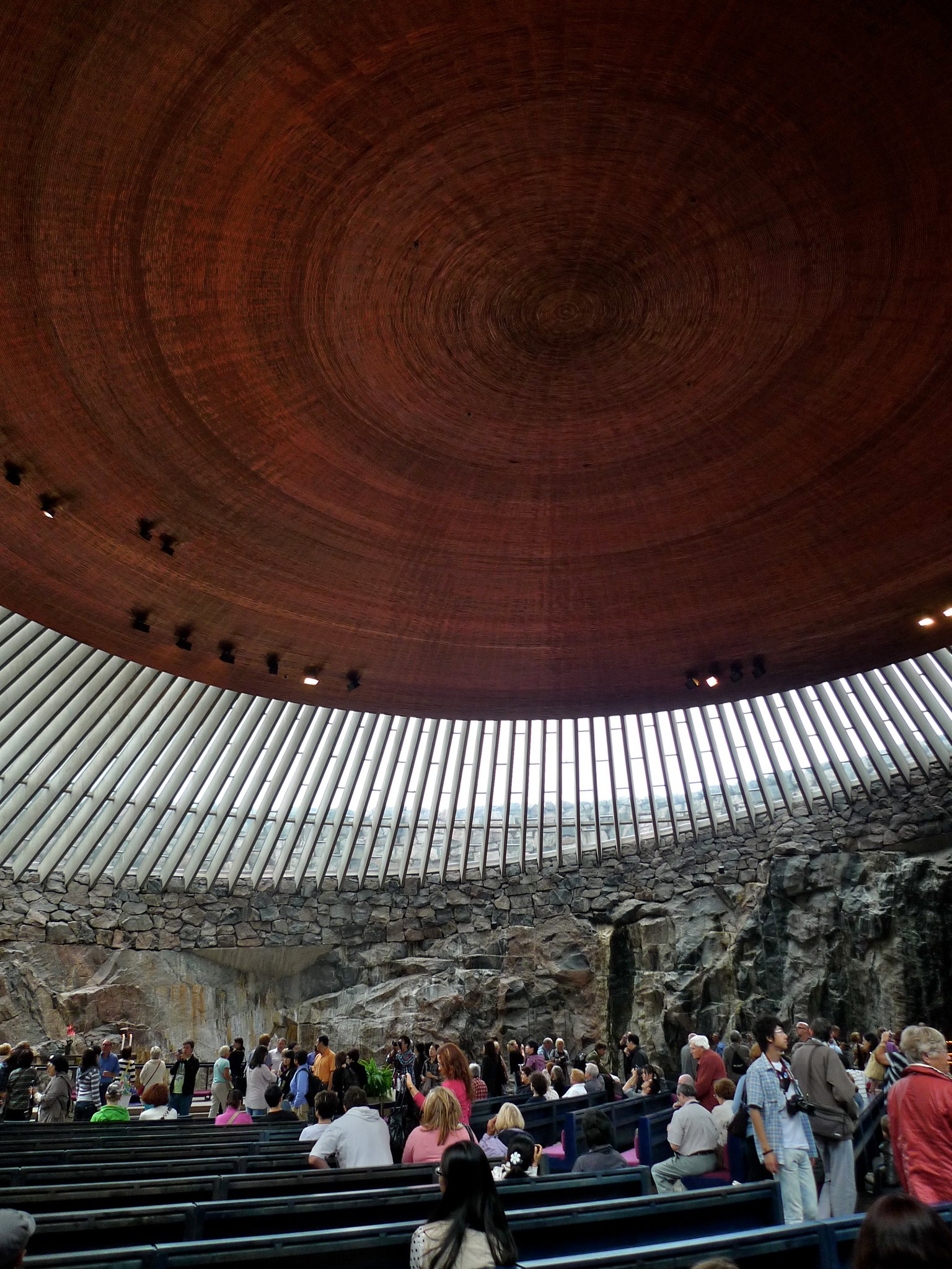 Vietimme Temppeliaukion kirkossa melko pitkän tovin, sillä Liz innostui kirkon erikoisesta olemuksesta. Ulos tullessamme huomasimme, että vettähän oli ripotellut melko lailla. ”Helsingin sää, et valehdellut!” Liz huudahti.