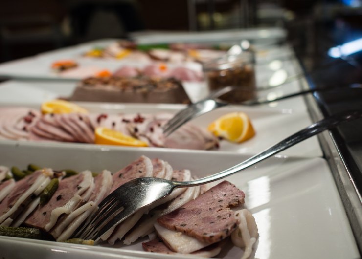 Matkan aikana pääsin kuvaamaan buffetin valmisteluja juuri ennen ravintolan avaamista yleisölle. Kamerallani poseerasivat henkilökunnasta Martini ja Jonas, joista jälkimmäinen leikkaa kinkkkua. Viking XPRS:n henkilökunnalle kiitos mielenkiintoisesta kurkistuksesta laivan keittön arkeen!