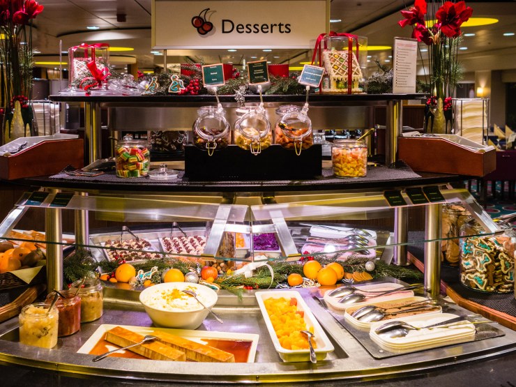 Herkkuja notkuneen, näyttävän jälkiruokapöydän jätin suosiolla lähes koskematta, mutta niin buffetissa on sallittua tehdä. Tilaa piti jättää myös paluumatkan ruoille Wine & Dine -ravintolassa.