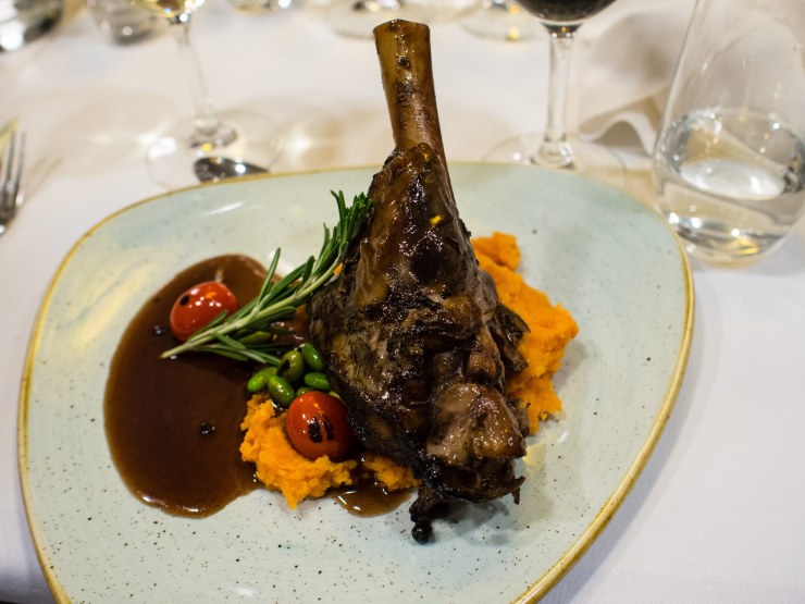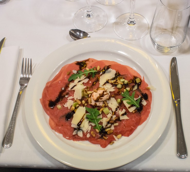 Wine & Dine ruoassa oli mielestäni hyvä hinta-laatusuhde. Söimme helmikuun loppuun saakka voimassa olevalta listalta alkuruoaksi vasikancarpacciota tomaattikreemillä ja parmesanilastuilla (9 €), pääruoaksi Ylikypsää karitsan potkaa ja mustaherukkakastiketta (20 €), bataattia ja papuja sekä jälkiruoaksi Tyrnipannacottaa ja valkosuklaamoussea (8 €).